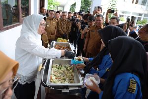 Setibanya di SMKN 1 Anyer, Andra Soni didampingi Ketua TP PKK Provinsi Banten Tinawaty Andra Soni langsung menuju lokasi para siswa antre untuk mendapatkan makanan dengan sistem prasmanan.