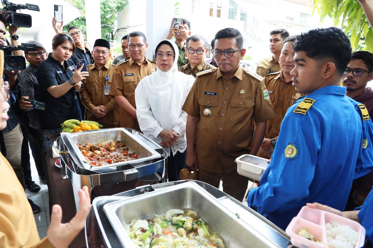 SERANG – Gubernur Banten Andra Soni meninjau uji coba Makan Bergizi Gratis (MBG) di SMK Negeri 1 Anyer, Kabupaten Serang. MBG di SMKN Anyer diselenggarakan Group Hotel Aston pada Selasa, (15/4/2025).